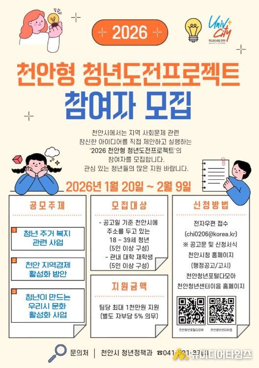 천안시는 ‘2026 천안형 청년도전프로젝트’ 참여자를 모집한다고 20일 밝혔다.