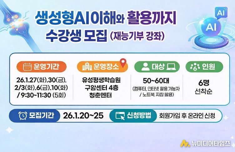 대전 유성구는 1월 27일부터 2월 10일까지 구암평생학습센터 4층 청춘엔터에서 ‘재능기부형 생성형 AI(인공지능) 교육 과정’을 운영한다.