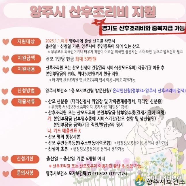 양주시보건소가 2025년 1월 1일 출생아부터 관내 출산가정을 대상으로 ‘양주시 산후조리비 지원사업’을 시행하고 있다.
