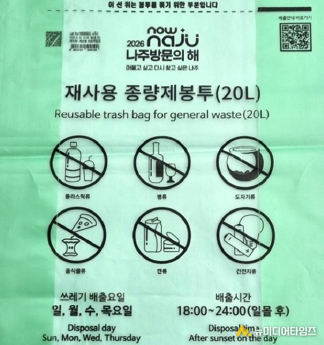 특히 종량제봉투는 사용 빈도가 높은 생활용품인 만큼 반복적인 노출을 통해 ‘2026 나주방문의 해’를 시민들에게 자연스럽게 각인시키는 홍보 효과가 있을 것으로 전망된다.