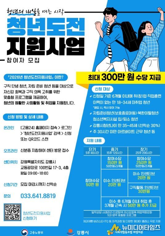 강릉시는 구직을 단념했거나 사회 진입에 어려움을 겪고 있는 청년들의 회복과 재도전을 지원하기 위해, ‘2026년 청년도전지원사업’ 참여자를 신규 모집하고 본격적인 사업 추진에 나선다고 밝혔다.