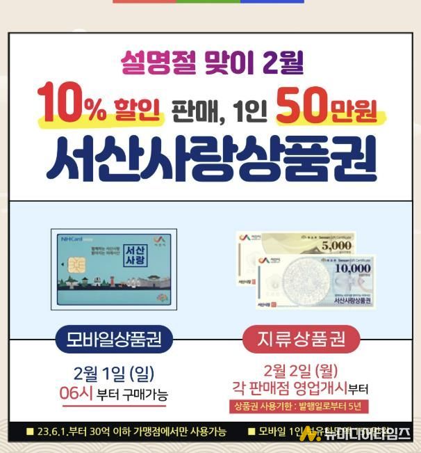 시는 2월 한시적으로 서산사랑상품권 1인당 구매 한도액을 기존 40만 원에서 50만 원으로 상향하고, 할인율은 기존과 동일한 10%를 적용한다.