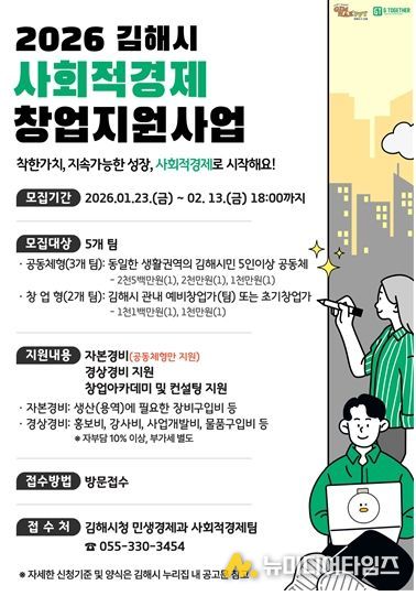 김해시는 오는 23일부터 2월 13일까지 2026년 사회적경제 창업 지원사업 에 참여할 팀을 모집한다.