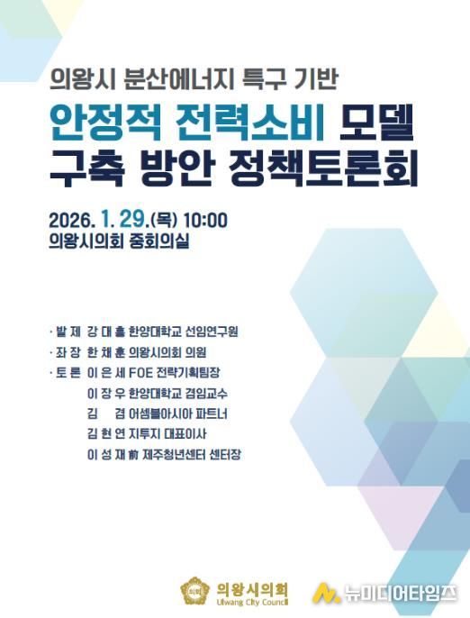 의왕시의회는 오는 29일 오전 10시, 시의회 중회의실에서 '의왕 분산에너지 특구 기반 안정적 전력소비 모델 구축 방안 정책토론회'를 개최한다고 밝혔다.