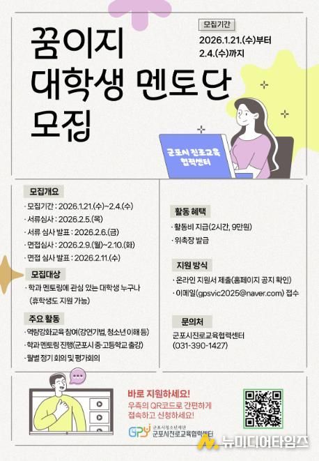 (재)군포시청소년재단 군포시진로교육협력센터는 관내 청소년의 진로 탐색과 진로 역량 강화를 위해 '2026년 군포시진로교육협력센터 교육기부자'를 모집한다고 밝혔다.