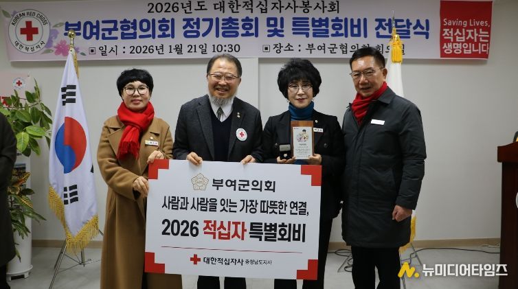 부여군의회는 21일 대한적십자사봉사회 부여군협의회 정기총회에서 2026년도 대한적십자사 특별회비 전달식을 가졌다.