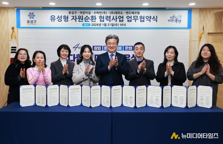 이번 협약은 어린이집과 기업이 협력해 고품질 재활용 자원을 회수하고, 새활용제품 소비와 체험 활동으로 연계하는 선순환 체계를 구축하기 위해 마련됐으며, 대전어린이집연합회 유성구지회·수퍼빈㈜·㈜재작소·앤드에코랩 등 8개 기관이 참여했다.