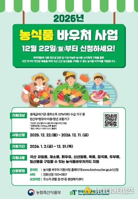 농식품 바우처 지원사업은 1월~12월까지 매월 지원받을 수 있으며 1인가구 월 4만원, 4인가구 월 10만원 등 가구원 수에 따라 차등 지원한다. 발급받은 카드로는 편의점, 하나로마트 등에서 국내산 채소, 과일, 흰 우유, 신선알류, 육류, 잡곡, 두부류, 임산물을 구매할 수 있다.