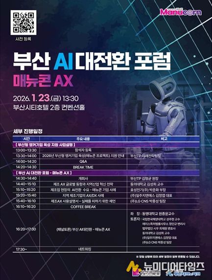 부산시는 23일 오후 1시 30분 연제구 부산시티호텔 2층 컨벤션홀에서 (재)부산테크노파크 주관으로 '2026 부산형 앵커기업 육성 지원사업 설명회 및 부산 AI대전환 포럼 – 매뉴콘 AX'를 개최한다고 밝혔다.