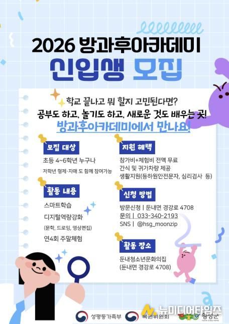 횡성군 둔내청소년문화의집이 지역 청소년의 균형 있는 성장을 돕기 위한 ‘2026년 방과후아카데미’ 신입생을 모집한다.