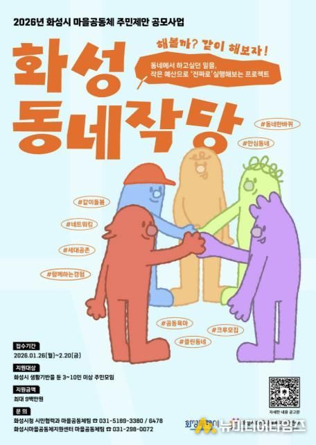 화성특례시가 주민 주도의 마을문제 해결과 공동체 활성화를 위한 ‘2026년 마을공동체 주민제안 공모사업’ 참여자를 오는 26일부터 2월 20일까지 모집한다고 23일 밝혔다.