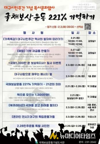 특히 ‘21일’을 기억하는 의미를 담아 대구시민주간 동안 도서 대출 권수를 21권으로 확대하는 ▲국채보상운동 221% 기억하기 – 21권의 의미 행사를 진행하고, 국채보상 시민 북챌린지로 ▲책으로 모으는 1,300만 원! 이벤트를 통해 13,000권 도서 대출을 달성한 후, 1,300권 단위로 해당 대출자에게 상품권을 증정한다.
