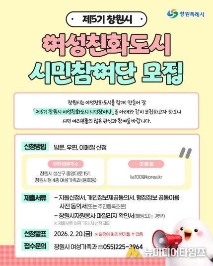제5기 시민참여단은 창원시에 주소를 두고 있는 사람을 대상으로 공개 모집하며, 100명 내외로 구성될 예정이다. 위촉 기간은 올해 3월부터 오는 2028년 2월까지 2년간이다. 제5기 창원시 여성친화도시 시민참여단 신청은 이메일·우편‧방문의 방법으로 신청할 수 있으며, 기타 자세한 사항은 창원시청 누리집 공고문에서 확인할 수 있다.