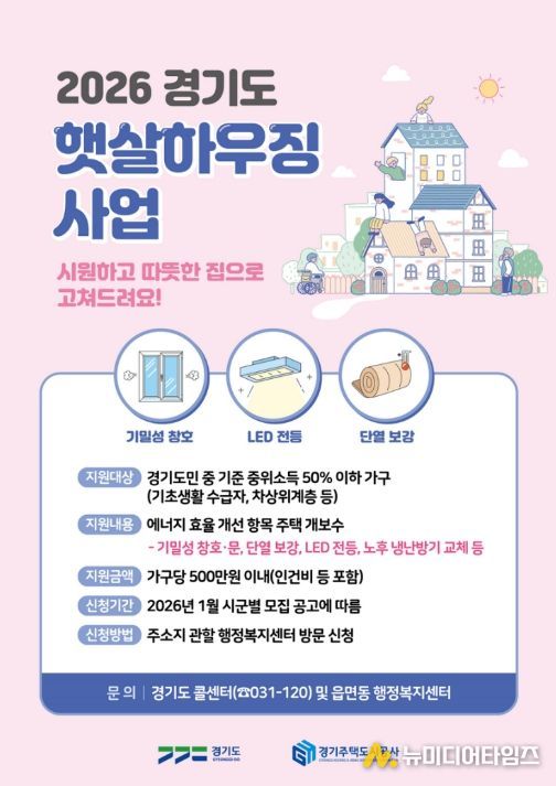 김태수 경기도 주택정책과장은 “햇살하우징 사업은 저소득 가구의 주택 성능을 근본적으로 개선해 쾌적한 주거환경을 조성하는 것이 목적”이라며 “도민들이 추위와 더위 걱정 없이 가정에서 생활할 수 있도록 주거 안전망을 더욱 공고히 구축하겠다”고 말했다.