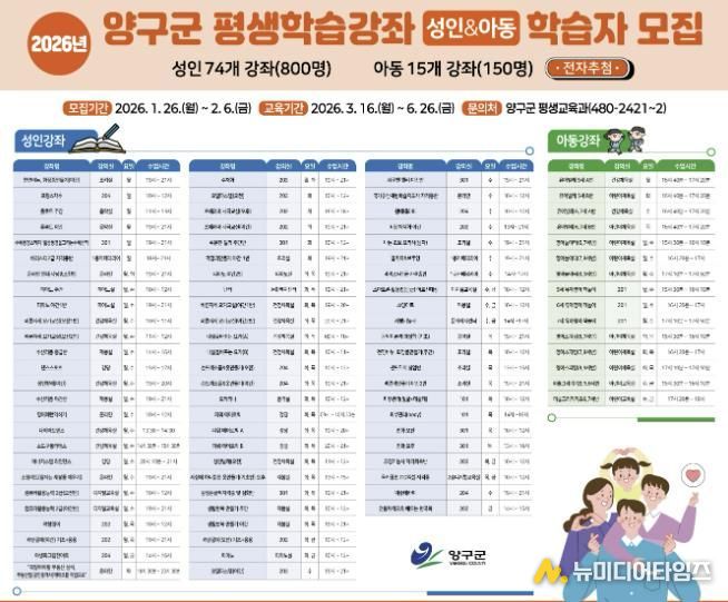 양구군은 1월 26일부터 2월 6일까지 12일간 상반기 평생교육 프로그램 학습자를 모집한다.
