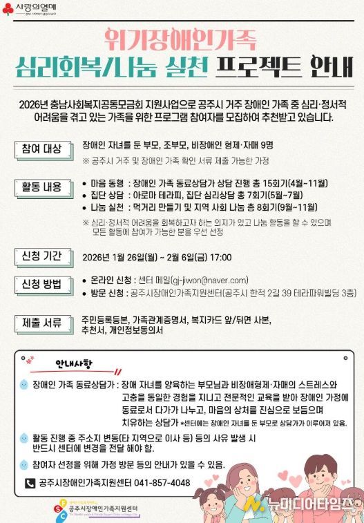 공주시 장애인가족지원센터는 2026년 충남사회복지공동모금회 지원을 받아 ‘위기 장애인가족 심리회복 및 나눔 실천 프로젝트’ 참여자를 모집한다고 26일 밝혔다.