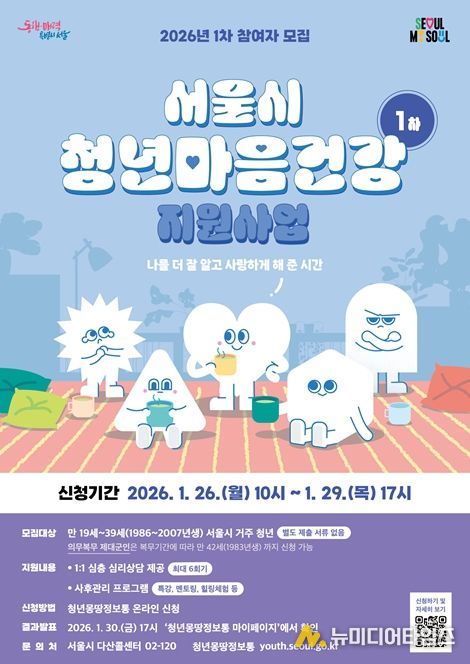 업그레이드된 ‘2026년 서울 청년 마음건강 지원사업’ 참여자 모집은 오는 26일 1차 2,500명을 시작으로 총 4회에 걸쳐 진행된다. 1차 신청 기간은 1월 26일 오전 10시부터 29일 17시까지다. 우울, 불안 등 정서적으로 어려움을 겪고 있는 서울 거주 19~39세 청년이면 누구나 청년몽땅정보통에서 신청할 수 있다.