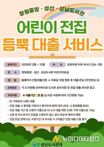 창원특례시 도서관사업소 성산도서관과는 초등학생 이하 자녀를 둔 가정을 대상으로 도서 구입비 부담을 줄이고 독서 생활화를 지원하기 위해, 어린이 전집 한 세트 전체를 한 달간 대출해주는 ‘듬뿍(Book) 대출 서비스’를 운영한다고 밝혔다.