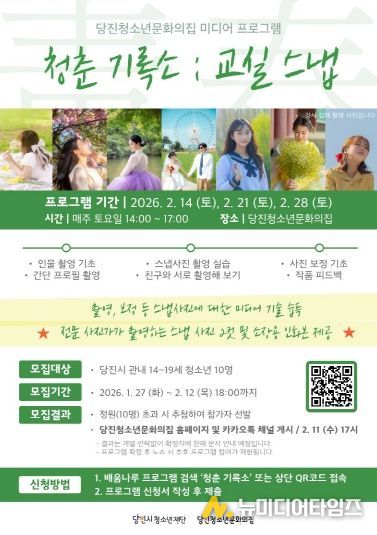 (재)당진시청소년재단 당진청소년문화의집(관장 유수민)은 오는 2월 14일부터 28일까지 매주 토요일, 14시부터 17시까지 관내 14~19세 청소년을 대상으로 미디어 프로그램 [청춘 기록소 : 교실 스냅]을 운영할 예정이다.