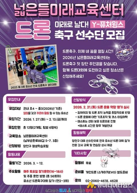 양천구는 드론 주행 기술과 스포츠를 결합한 유소년 드론축구단 ‘Y-퓨처윙스’를 창단하고, 하늘 위에서 펼쳐지는 짜릿한 승부를 함께 경험할 창립 멤버를 오는 2월 13일까지 모집한다고 밝혔다.