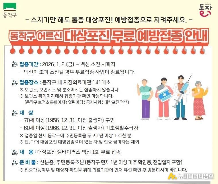 구에 따르면 올해 접종 대상은 작년과 동일하다. 생년월일 기준으로 70세 이상 구민은 1956년 12월 31일, 60세 이상 기초생활수급자는 1966년 12월 31일 이전 출생자가 해당된다.