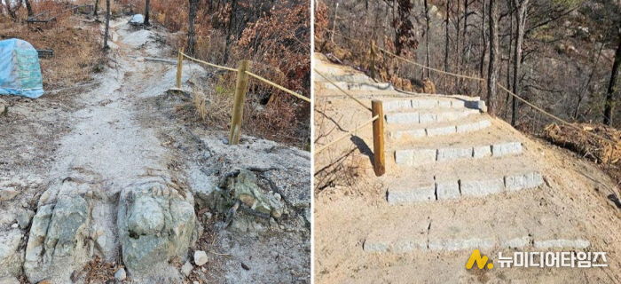 토사 침식이 우려되는 곳과 급경사 암반 지역 등 200m 구간에 폭 2m의 돌계단과 안전난간 및 손잡이를 설치해 등산 보행 안전성을 크게 높였다.