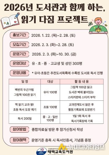 태백교육도서관(관장 정미라)은 2월 3일부터 10월 30일까지 유아부터 성인까지 전 연령을 대상으로 독서 습관 형성과 지속적인 독서 실천을 지원하기 위해 ‘도서관과 함께하는 읽기 다짐 프로젝트’를 운영한다.