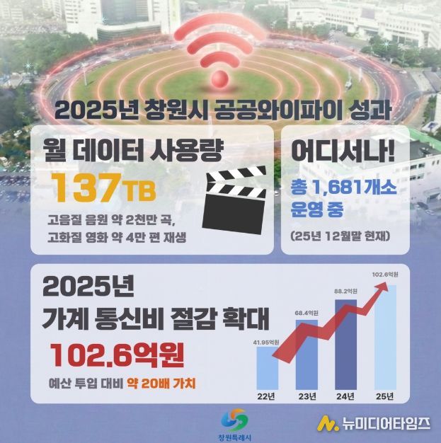 창원특례시가 시 전역 1,681개소에 설치·운영 중인 공공와이파이의 2025년 성과를 분석한 결과, 지난해보다 20.4억원이 증가한 102.6억원의 가계 통신비 절감을 이뤘다고 밝혔다.