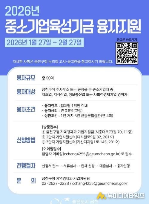 금천구는 자금 운용에 어려움을 겪는 지역 내 중소기업을 지원하기 위해 50억 원 규모의 ‘2026년도 중소기업육성기금 융자지원 사업’을 추진한다고 밝혔다.