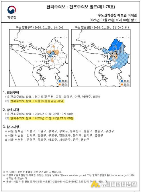 28일 밤 9시를 기점으로 서울 동남권을 제외한 3개 권역(동북권·서남권·서북권)에 한파주의보가 발효됨에 따라, 서울시는 한파 종합지원상황실을 가동하고 자치구 및 유관기관과 협력해 시민 보호와 취약시설 안전관리를 강화한다고 밝혔다.