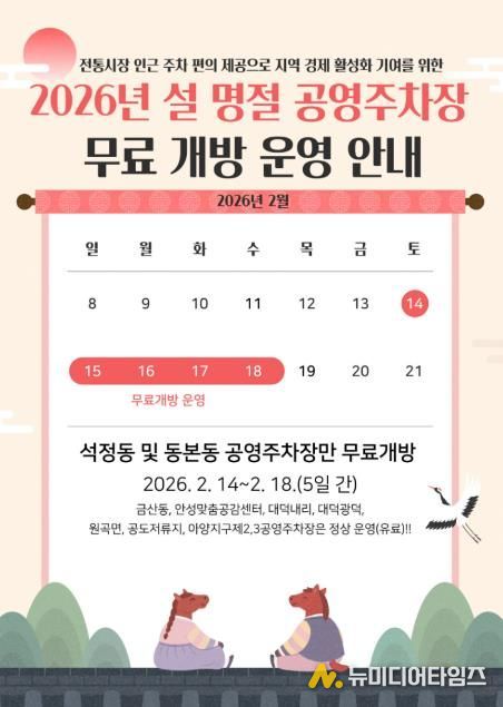 안성시시설관리공단은 2026년 설 명절을 맞아 2월 14일부터 18일까지 5일간, 공단이 관리하는 공영주차장 중 전통시장 인근에 위치한 석정동 공영주차장과 동본동 공영주차장을 한시적으로 무료 개방한다고 밝혔다.