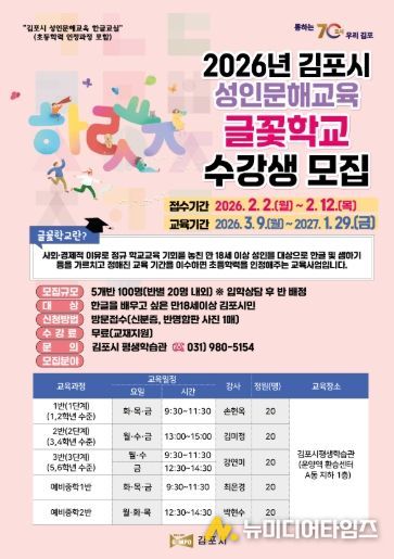 김포시는 배움에 대한 열정을 다시 시작하고자 하는 시민을 대상으로 2026년 성인문해교육 ‘글꽃학교’ 수강생을 2월 2일부터 2월 12일까지 모집한다고 밝혔다.