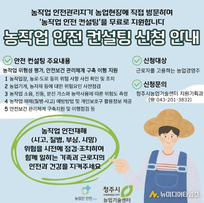 청주시농업기술센터는 농작업 안전재해 예방 지원체계 구축사업의 일환으로 추진하는 ‘농작업 안전보건 컨설팅 지원사업’에 참여할 농업경영주를 2월 27일까지 모집한다.