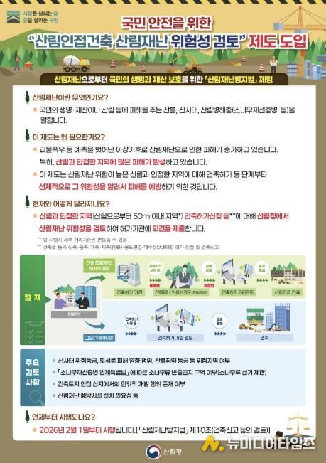 이번 제도는 산림으로부터 50m 이내 지역에서 건축물 신축·증축 등을 할 경우, 건축허가나 신고수리 과정에서 지방산림청에 통보하고 산림재난 위험성에 대한 검토의견을 받도록 하는 제도로, 건축 이후 발생할 수 있는 재난 피해를 사전에 차단하는 데 목적이 있다.