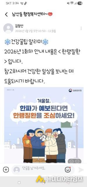 문영이 남산동장은 “주민 건강은 지역사회의 가장 중요한 가치인 만큼, 앞으로도 알찬 건강 정보 제공과 다양한 건강 증진 사업을 통해 주민 모두가 건강하고 행복한 남산동을 만들어 가도록 최선을 다하겠다”라고 전했다.