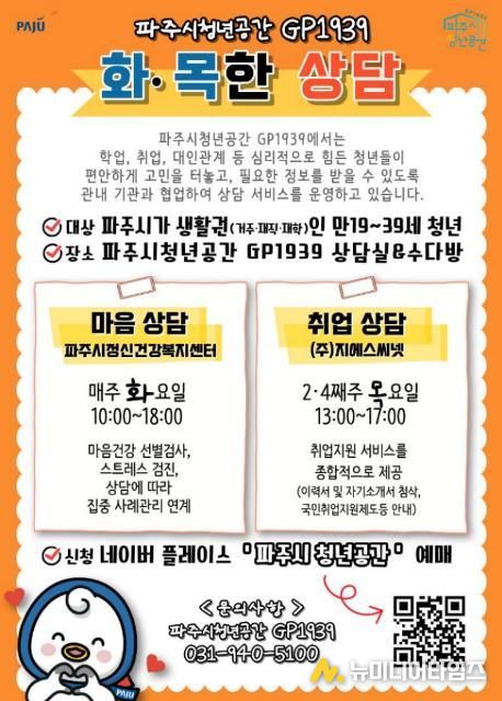 파주시는 청년들의 심리 안정과 취업 역량 강화를 위해 파주시청년공간 지피(GP)1939에서 진행하는 상담 프로그램 ‘화·목한 상담’의 참여자를 모집한다.