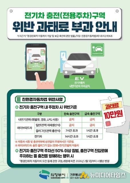 의정부시는 환경친화적 자동차 전용주차(충전)구역에 대해 주정차 위반 단속을 시행하고 있다고 29일 밝혔다.
