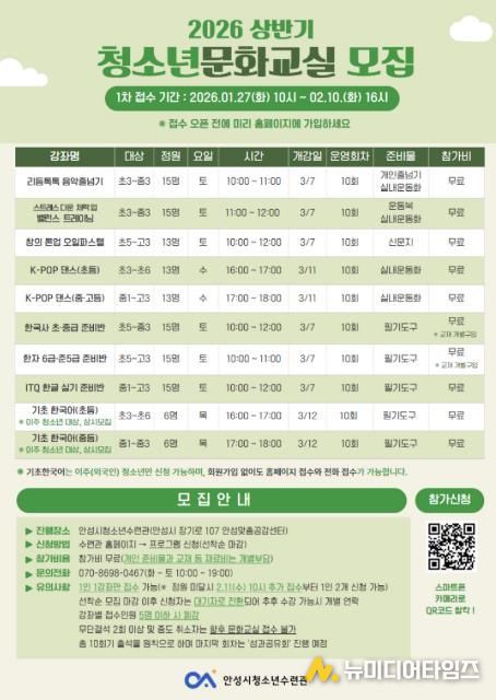안성시청소년수련관이 지역 청소년들의 건강한 여가 선용과 자기계발을 위해 1월 27일부터 2월 10일까지 ‘청소년 문화교실’ 수강생을 모집한다.