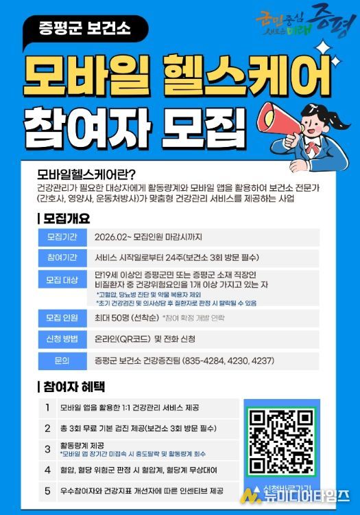 증평군보건소가 군민 건강 증진을 위한 ‘2026년 모바일 헬스케어사업’참여자 50명을 2월 2일부터 선착순 모집한다.