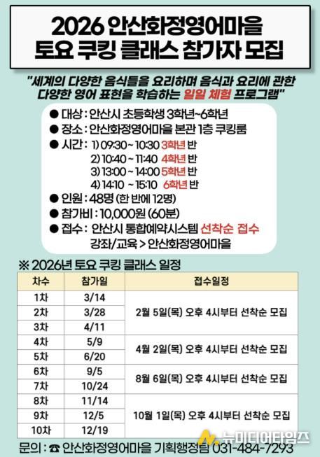 민진영 안산화정영어마을 원장은 “토요 쿠킹 클래스는 높은 만족도와 수요를 기록해 온 영어마을의 대표 프로그램 중 하나”라며 “관심 있는 학생들의 많은 참여를 바란다”고 당부했다.
