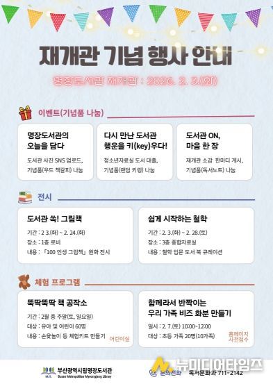 부산광역시립명장도서관(관장 조수금)은 재개관을 기념해 2월 한 달간 시민과 함께하는 전시·체험·이벤트 프로그램을 운영한다.
