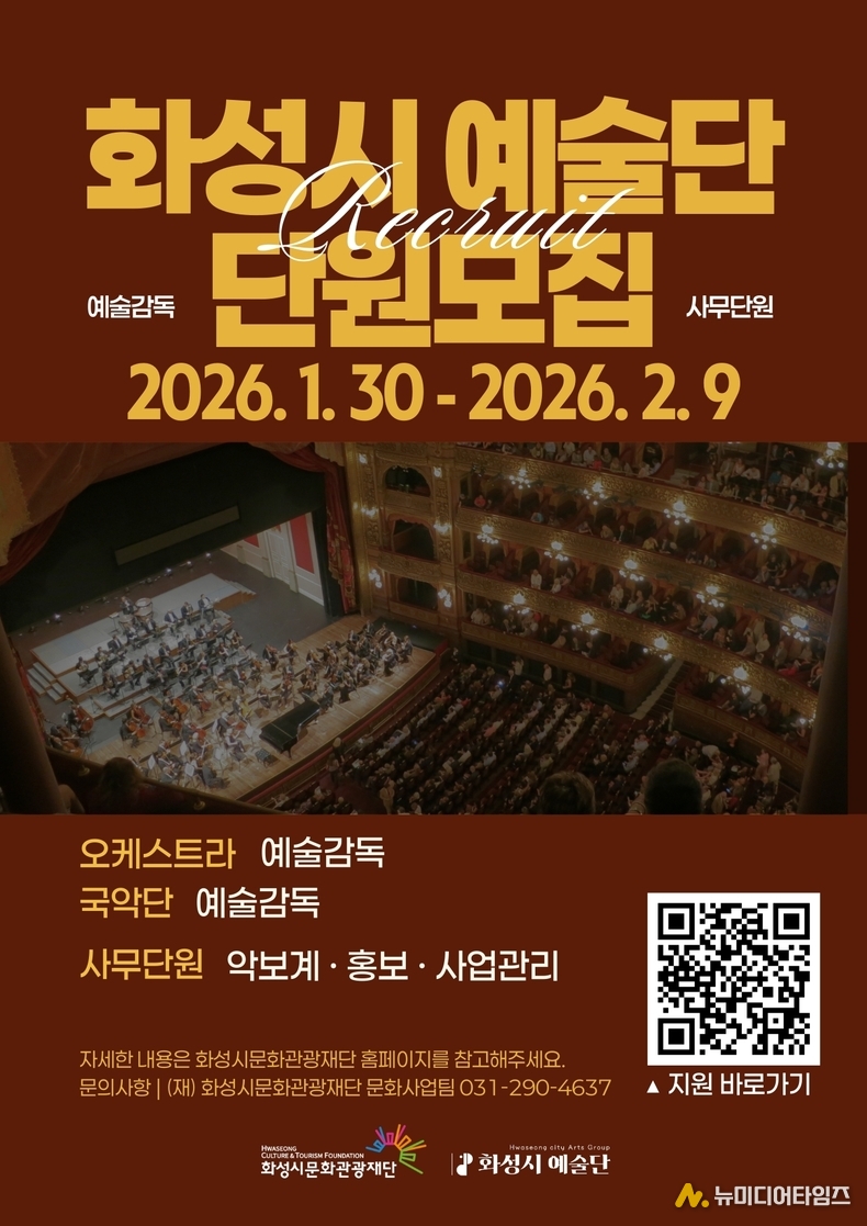 (재)화성시문화관광재단(대표이사 안필연)은 2026년 ‘화성시 예술단’을 이끌어갈 예술감독과 사무단원을 모집한다.