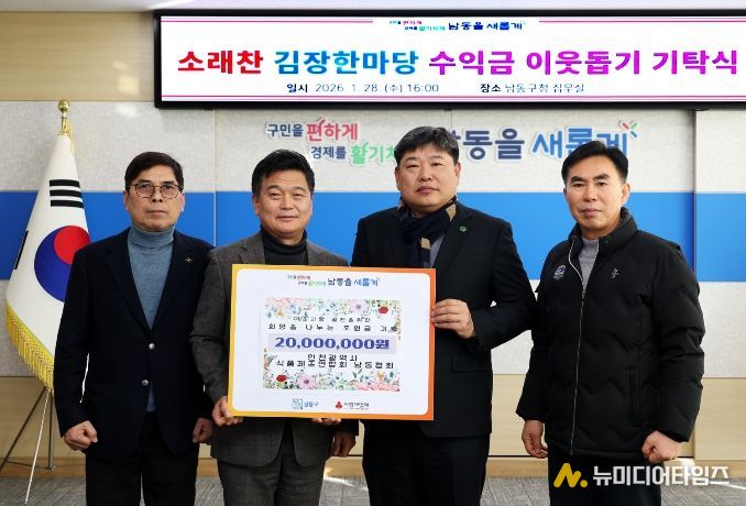 인천시 남동구는 최근 (사)인천식품제조연합 남동구협회로부터 ‘2025년 남동구 소래찬 김장한마당’ 판매 수익금 총 2천만 원을 기탁받았다고 30일 밝혔다.