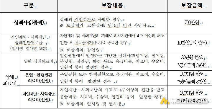 올해는 각종 재난 발생에 대비해 보장항목을 확대하여 온열·한랭질환 의료비(100만 원 한도)와 자연재난·사회재난 의료비(200만 원 한도)를 새롭게 추가했다.