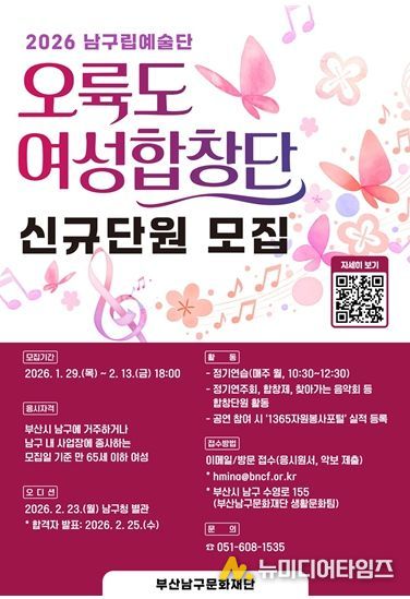 (재)부산남구문화재단은 남구립 오륙도여성합창단의 2026년 신규 합창단원을 1월 29일부터 2월 13일까지 공개 모집한다고 밝혔다.