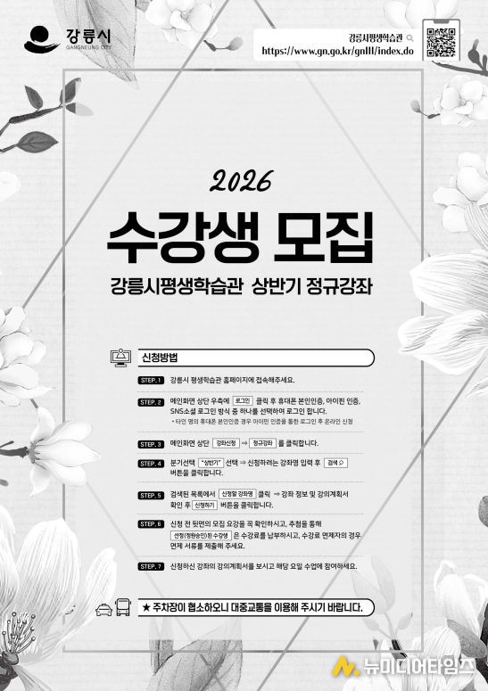 강릉시 평생학습관은 시민의 역량을 강화하고 평생학습 저변확대를 위한 '2026년 상반기 평생학습관 정규강좌'수강생을 모집한다.