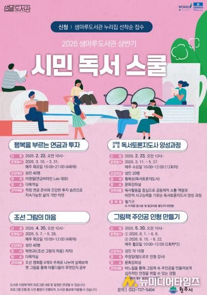 원주시 샘마루도서관은 시민들의 독서문화 향유 기회를 확대하기 위해 오는 3월부터 6월까지 ‘상반기 시민 독서 스쿨’ 프로그램을 운영한다.