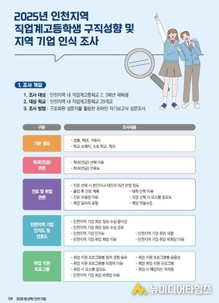 가이드북은 인천시와 중부지방고용노동청(청장 김윤태)이 공동으로 발간한 자료로, 인천지역 직업계 고등학교 학생 3,115명을 대상으로 실시한 실태조사를 바탕으로 제작됐으며, 직업 선택 시 중요하게 고려하는 요소와 인천지역 기업 취업 의향 등 청년들이 궁금해하는 기업 정보를 충실히 담았다.