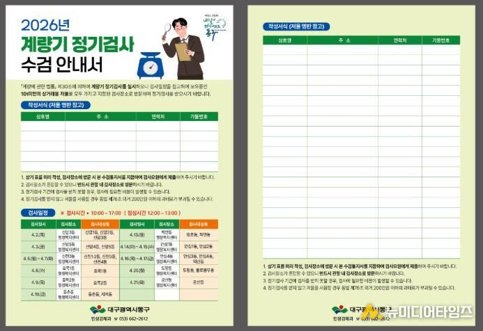 대구 동구청은 ‘2026년 계량기(저울) 정기검사’를 앞두고 2월부터 사전 수요 조사에 나선다.