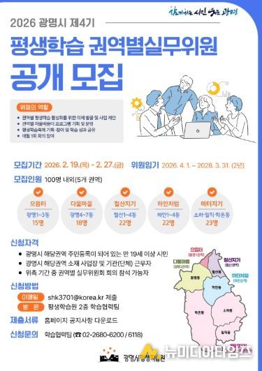 광명시가 시민 주도의 생활권 중심 평생학습 정책을 강화하기 위해 ‘제4기 평생학습 권역별실무위원회’ 신규 위원 100명을 공개 모집한다.